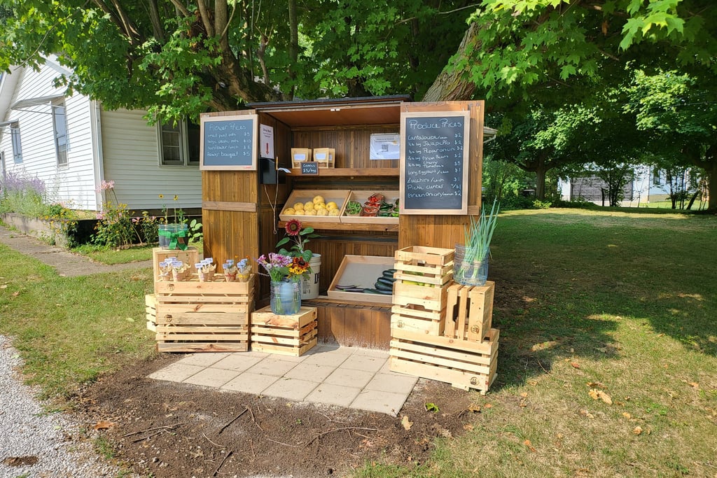 Here, we sell fresh produce grown in our organic garden, fresh cut flowers, and fresh baked goods.